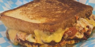 Two slices of Texas Toast each with Colby Jack slices of cheese, inside filled with eggs, bacon or sausage, blended with mozarella cheese. Absolutely delicious!