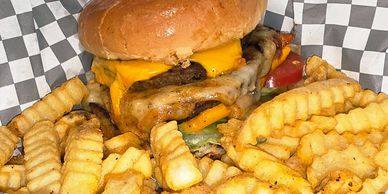 Double meat 80% lean with triple cheese colby jack and mozarella plus crinkle fries